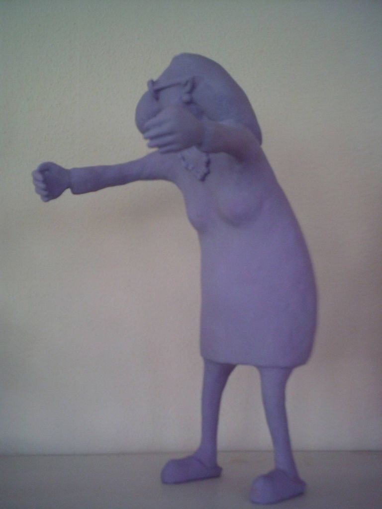 Im Oktober 2003 traf ich den Vorlagenschöpfer meiner plastischen Comic-Figuren, den TAZ-Comic-Künstler Tom Körner, auf der Frankfurter Buchmesse. Es entstand die Idee, seine - bisher gezeichneten - Comic-Figuren als Plastiken enstehen zu lassen. Ich modellierte verschiedene Figuren, eine davon ist die lebensgroße Plastik der Oma Gräte. Wir reisten gemeinsam am 14. September 2007 nach Berlin um Tom Körner zu besuchen. (K.W.)