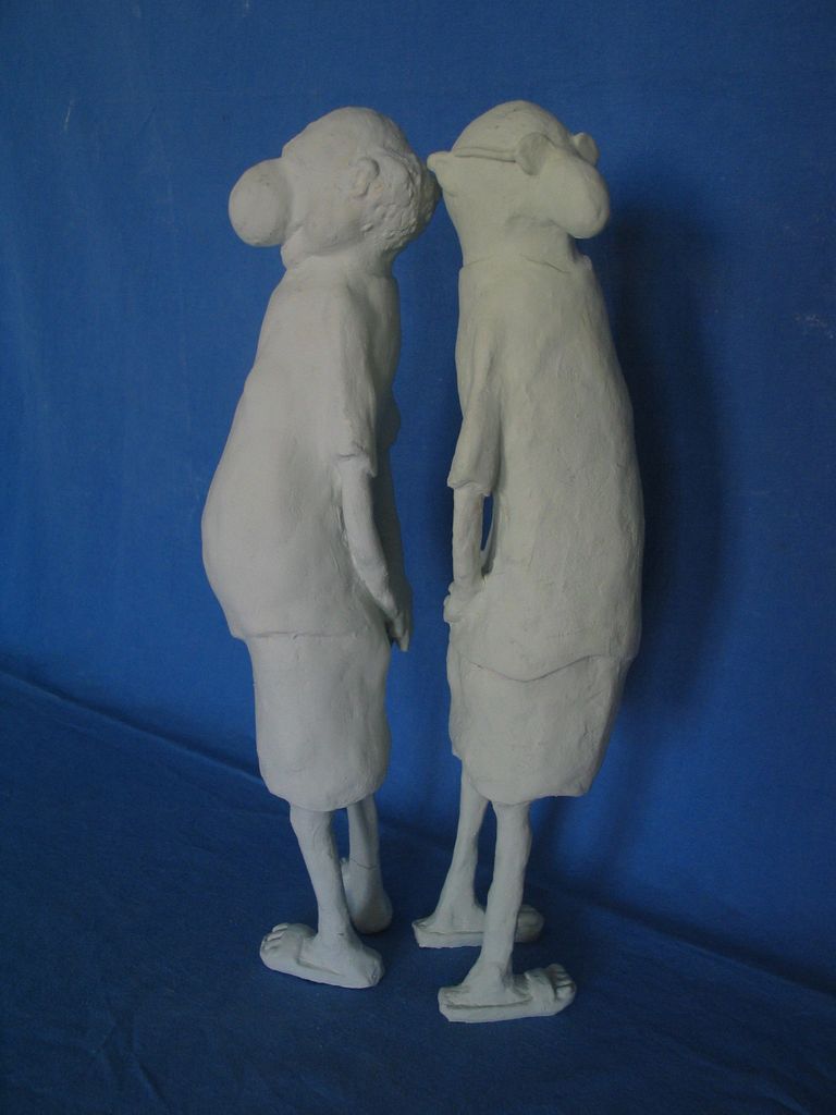 Die plastischen Figuren sind Aufbaumodellierungen mit Drahtgerüst, Pappmaschee und Modelliermasse